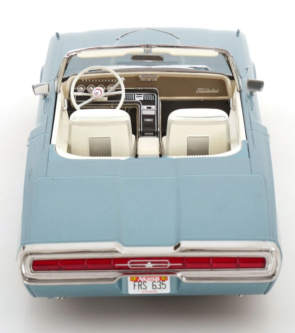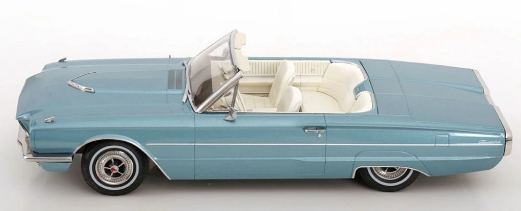 KK Scale 181341 referans numaralı model, Thunderbird Cabrio’nun karakteristik hatlarını, detaylı ön panjur ve far tasarımını ve kabin çizgilerini gerçeğe uygun oranlarda yansıtır. Die-cast metal gövde sağlam ve kaliteli bir hissiyat sunarken; krom detaylar, jant tasarımı ve iç mekân koltuk ile konsol detayları özenle modellenmiştir. 1/18 ölçek, hem dış tasarım hem de iç mekân unsurlarının vitrin sergilemesinde net biçimde öne çıkmasını sağlar.
